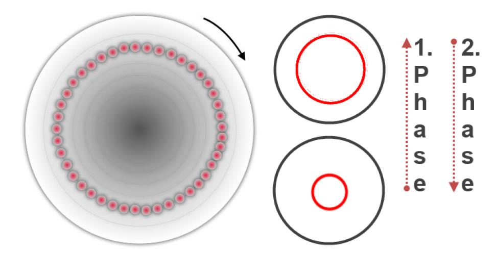 Schwingender Kreis: Das Display muss einen schwingenden Kreis darstellen können. Das bedeutet, dass von der dem Rotationspunkt naheliegensten LED, ein Kreis mit immer größer werdenden Radius angezeigt wird und beim Erreichen des Radiusmaximums wieder zurück schwingt. Die Periodendauer soll sechs Sekunden betragen.