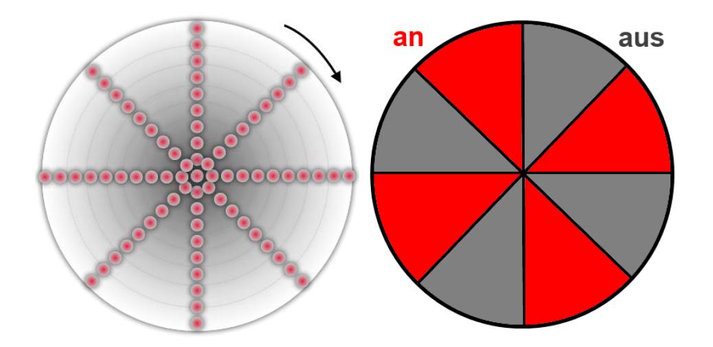 Kuchen: Bei diesem Muster liegt die Schwierigkeit darin, ein statisches Bild darszustellen. Die Winkelkoordinate der LED's findet nun Beachtung. Es sollen acht gleich große Bereiche angezeigt werden, bei denen nur jeder zweite leuchtet, sodass eine Art kuchenähnliches Gebilde entsteht.